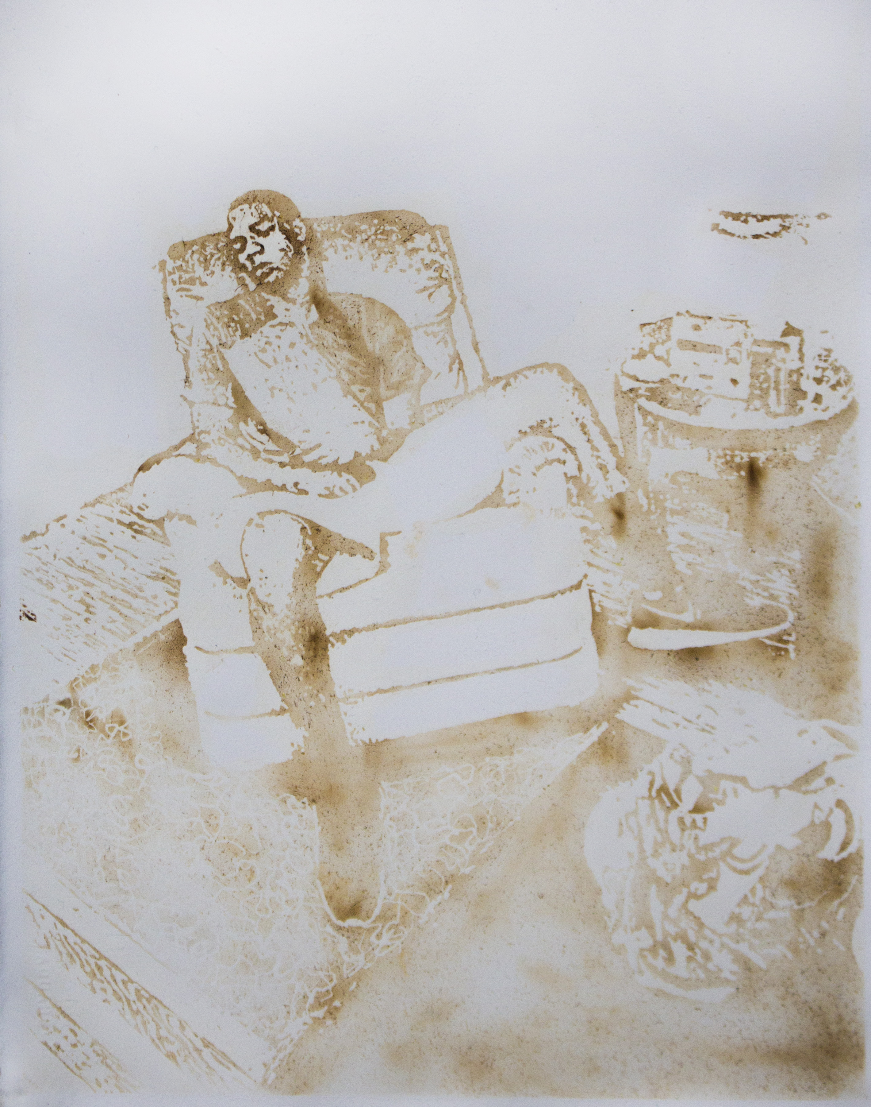 Marcel Passed Out in a Chair. Smoke Resin on Paper. 14 by 11 inches. Alfred. 2014